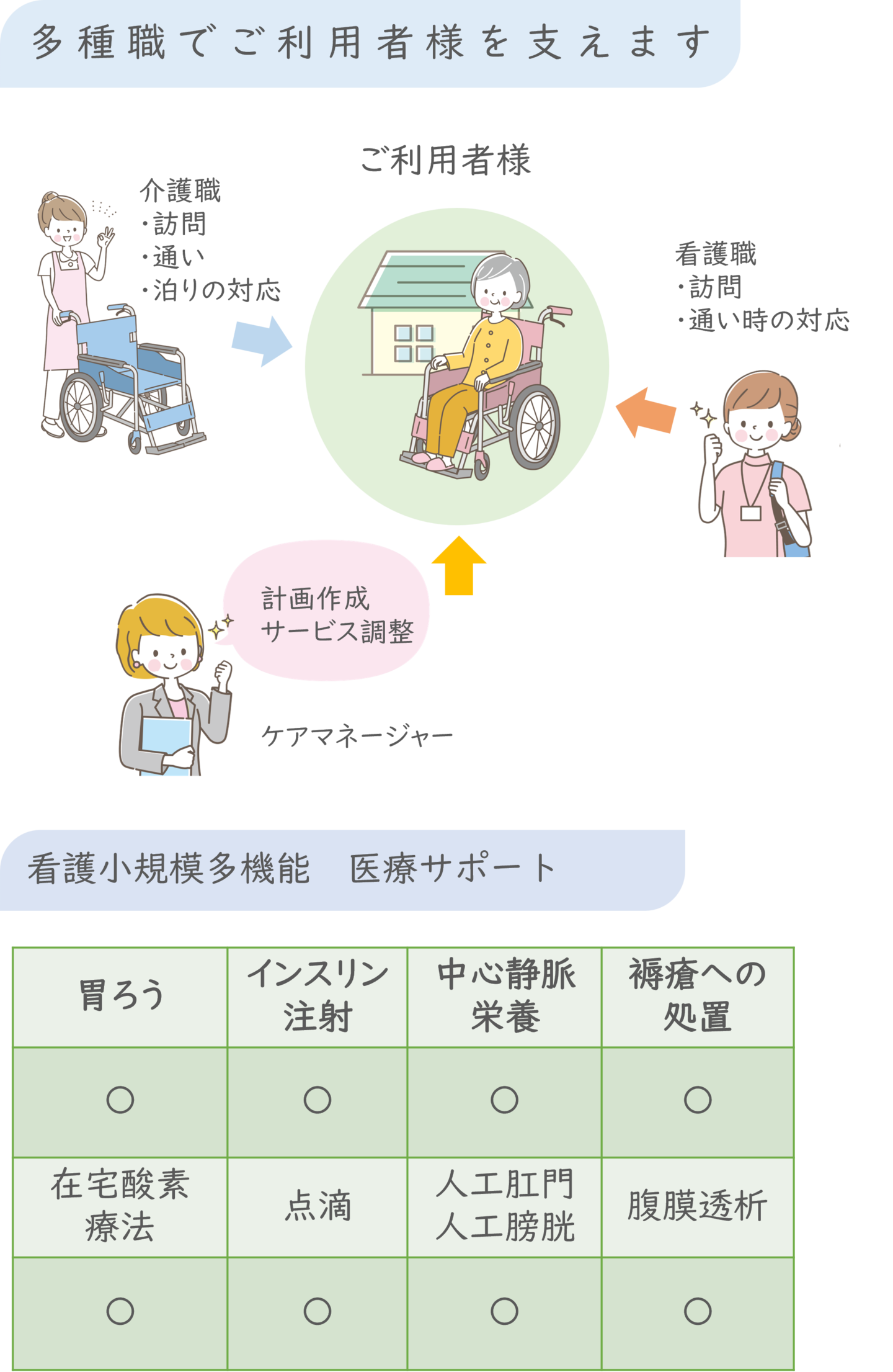 訪問看護ステーションわらくは看護小規模多機能ホームわらく木曳野の併設型。